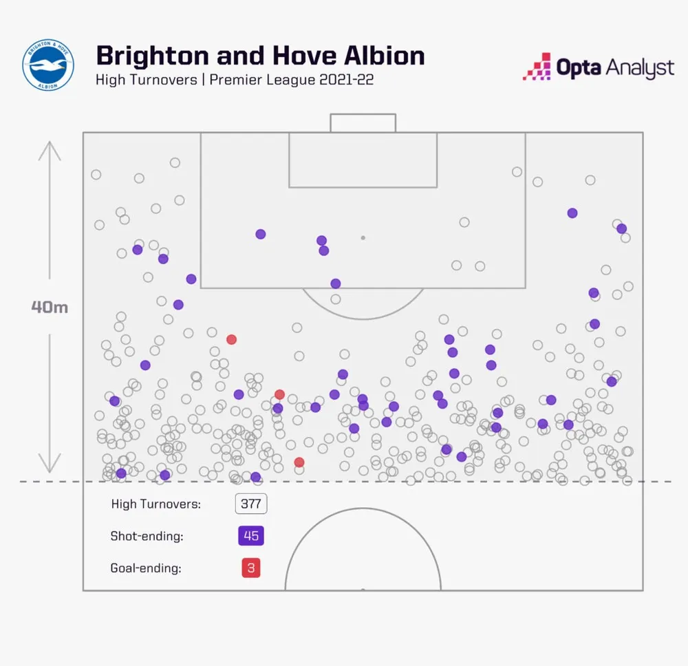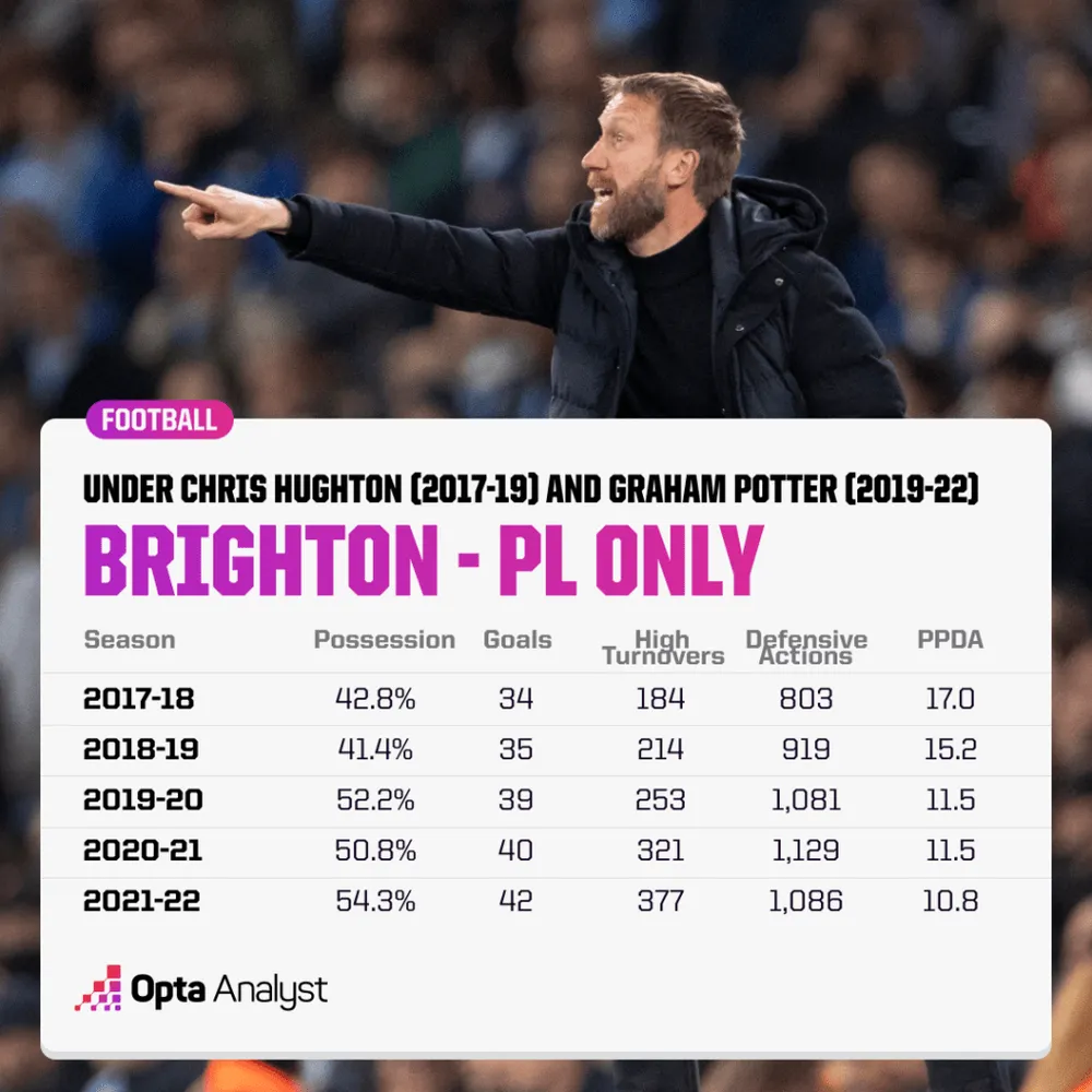 Brighton của Hughton xếp cuối cùng về số lần mất bóng nhiều mỗi trận - số lần sở hữu bóng bắt đầu trong thế trận mở và bắt đầu cách khung thành đối phương 40 mét trở xuống - tại Premier League vào mùa giải 2017-18 (4,8) và thứ 16 vào mùa giải 2018-19 (5,6). Con số đó tăng lên thứ chín vào mùa giải tiếp theo (6,7) dưới thời Potter. Sau đó, họ vươn lên thứ ba vào cả mùa giải 2020-21 (8,4) và 2021-22 (9,9) chỉ sau Liverpool và Manchester City.