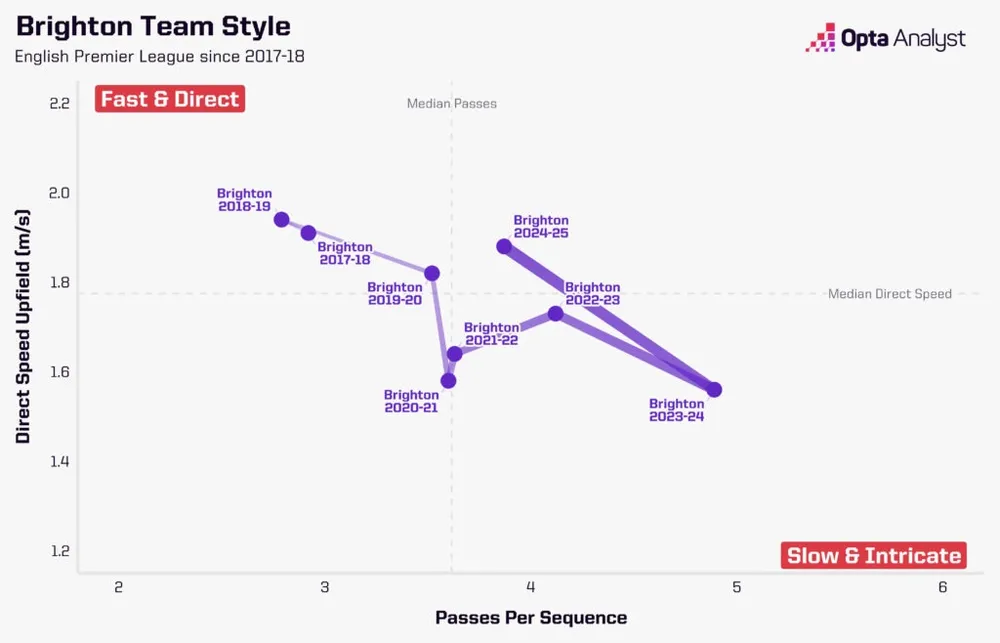 Bạn có thể thấy từ đồ họa bên dưới về cách lối chơi của Brighton đã thay đổi kể từ mùa giải 2017-18. Các mùa giải dưới thời Potter chứng kiến họ chuyển từ lối chơi nhanh và trực diện sang lối chơi chậm rãi và phức tạp được các đội như Man City, Arsenal và Chelsea sử dụng.