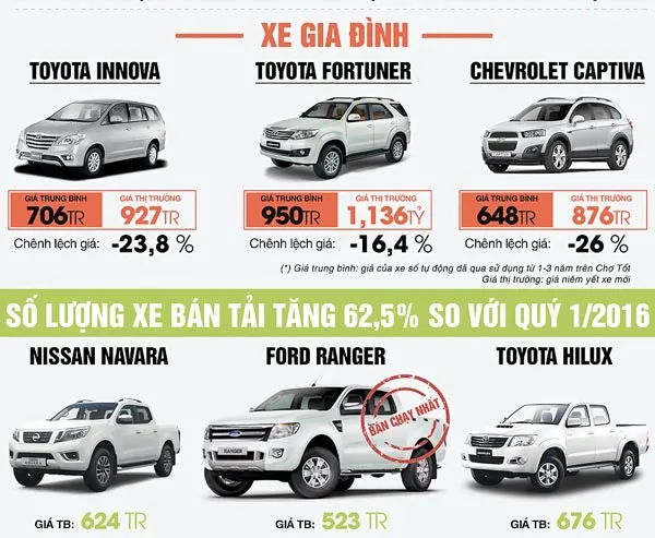 Đối với dòng xe gia đình là những xe 7 chỗ có khả năng chuyên chở đa dạng, Toyota Innova vẫn “bất bại” trong thị trường mua bán xe đã qua sử dụng tại Việt Nam khi tăng 61% số xe so với quý trước, giữ vị trí dòng ô tô gia đình 7 chỗ phổ biến nhất. Người tiêu dùng có thể sở hữu một chiếc Innova đã qua sử dụng 1-3 năm trên Chợ Tốt với giá trung bình 706 triệu đồng, trong khi giá thị trường cho xe mới cao hơn 24%. Người anh em Toyota Fortuner cũng không kém cạnh khi tăng 21% số xe và đa phần là những mẫu đời 2010-2014. Chevrolet Captiva đứng thứ 3 trong tốp xe bán chạy với số lượng tăng nhẹ so với quý trước nhờ sự xuất hiện của Captiva Revv 2016, chiếm 42% tin đăng.