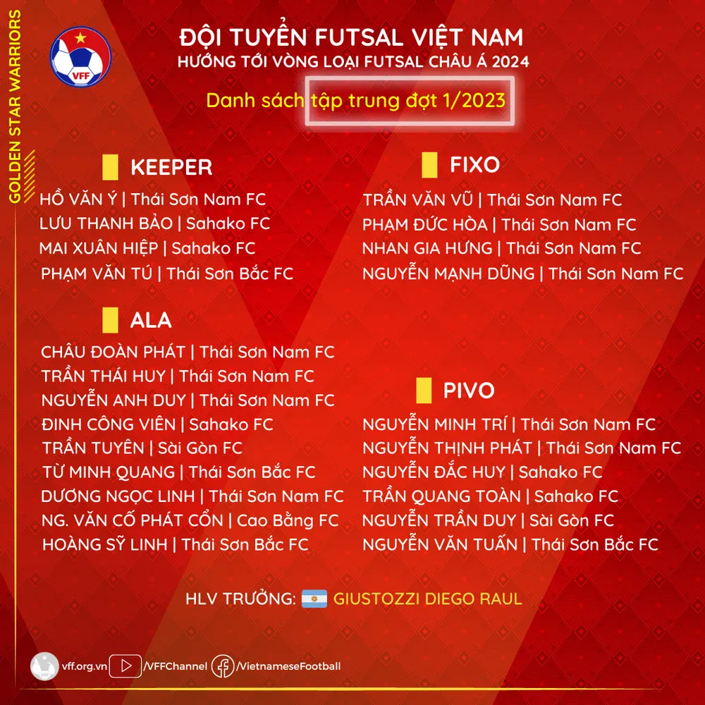 Vì vậy, nhằm giúp HLV trưởng Giustozzi có sự chuẩn bị tốt nhất về lực lượng và xây dựng lối chơi cho đội tuyển hướng tới mục tiêu giành vé dự VCK futsal châu Á 2024 và hướng tới cạnh tranh suất dự VCK FIFA futsal World Cup 2024, LĐBĐ Việt Nam đã tạo điều kiện để đội tuyển có thể tập trung thành nhiều đợt khác nhau trong năm 2023.