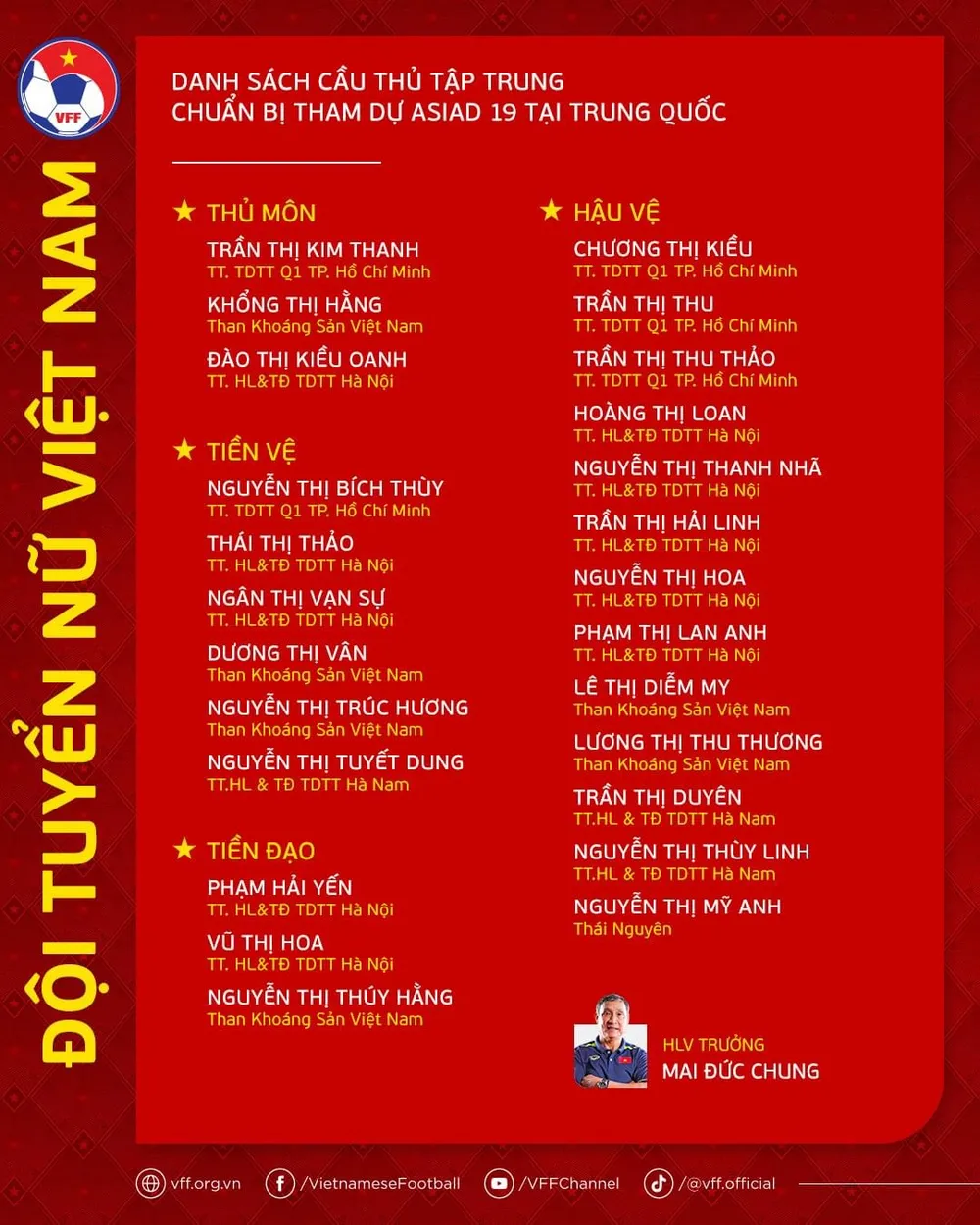HLV Mai Đức Chung và các cộng sự bổ sung nhiều gương mặt trẻ như Nguyễn Thị Hoa, Phạm Thị Lan Anh (Hà Nội); Trần Thị Duyên, Nguyễn Thị Thùy Linh (Hà Nam), nâng số cầu thủ sinh sau năm 2000 của đội tuyển nữ Việt Nam lên 11 cầu thủ (trên tổng số 25 cầu thủ được triệu tập).