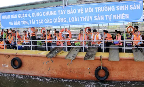 Sáng 29-3, Ban chỉ đạo phong trào “Toàn dân đoàn kết xây dựng đời sống văn hóa” quận 4 TPHCM tổ chức chương trình “Thả cá về thiên nhiên”, với hơn 200.000 con (khoảng 1 tấn) cá các loại xuống khu vực kênh Tàu Hủ - Bến Nghé (ảnh).