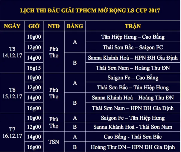 Giải futsal TPHCM mở rộng – tranh cúp LS năm 2017 được diễn ra tại NTĐ Phú Thọ và NTĐ Thái Sơn Nam (TPHCM) từ ngày 14-12 đến 20-12-2017. Giải đấu năm nay quy tụ 8 đội bóng tham dự gồm: Cao Bằng, Tân Hiệp Hưng, Sài Gòn FC, Thái Sơn Bắc, Thái Sơn Nam, Hoàng Thư Đà Nẵng, Sanna Khánh Hòa và HPN ĐH Gia Định. Các đội bóng đươc chia thành 2 bảng, thi đấu vòng tròn một lượt tính điểm để chọn ra hai đội nhất và nhì mỗi bảng vào bán kết, chung kết.