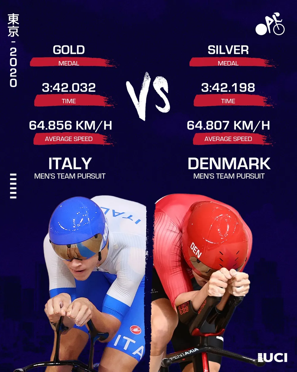 Nhưng đúng thời điểm khó khăn này, tuyển Italy lại đến “tài” Filippo Ganna lên kéo. Filippo Ganna đã ấn bàn đạp tăng tốc mạnh mẽ, kéo đồng đội vượt qua Đan Mạch trong tích tắc cuối cùng. Kết quả, tuyển Ý tiếp tục phá thêm một kỷ lục thế giới để giành HCV với thành tích 3 phút 42,032 giây, chỉ hơn tuyển Đan Mạch 0,166 giây.