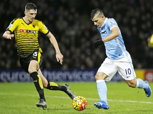 Tiền đạo Sergio Aguero đi bóng trước hậu vệ Craig Cathcart của Watford (Ảnh: Sportinglife)