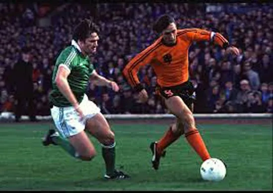 Johan Cruyff (phải), đội trưởng Cơn lốc màu da cam, thời tung hoành sân cỏ thế giới những năm 1970 của thế kỷ trước