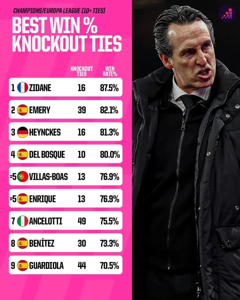 Nếu chỉ tính các vòng knock-out của Champions League (từ 1992) và Europa League (từ khi đổi tên từ UEFA Cup năm 2009), Emery có 32 chiến thắng trong 39 trận đấu. Tỷ lệ thành công 82,1% của ông chỉ đứng sau Zinedine Zidane (87,5%) trong số các HLV tham gia ít nhất 10 trận knock-out, và Zidane chỉ đấu 16 trận như vậy, khiến thành tích của Emery có thể được xem là ấn tượng hơn. Emery vượt qua nhiều tên tuổi lớn trong danh sách này, như Jupp Heynckes, Vicente Del Bosque, Carlo Ancelotti và Pep Guardiola. Một cái tên lớn khác trong danh sách – nhưng vẫn dưới Emery – là nhà cầm quân hiện tại của PSG, Luis Enrique.