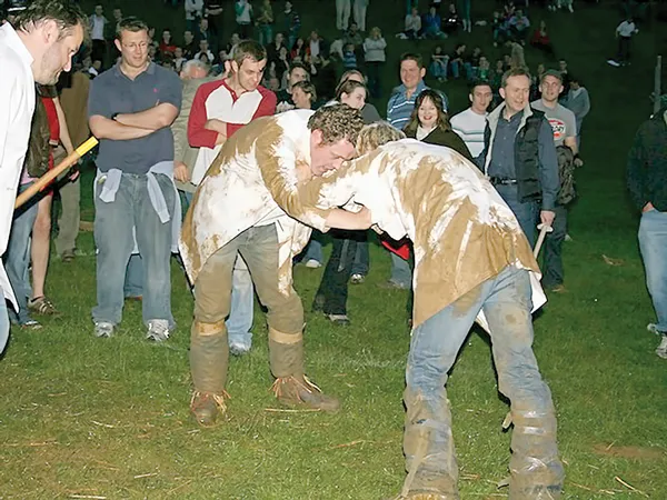 Đá ống chân là môn thể thao mà 2 người chơi phải nắm chặt vai nhau và đá vào ống chân của đối thủ. Người bị ngã sẽ là kẻ thua cuộc. Để giảm chấn thương, người chơi phải nhét rơm vào trong tất trước khi tham gia thi đấu. Luật chơi ngày nay quy định đối thủ nào đá vào ống chân đối thủ 2 lần trước sẽ là người chiến thắng. Để đề phòng chấn thương có thể xảy ra khi đối thủ đá quá mạnh, luôn có ít nhất 1 xe cứu thương túc trực sẵn bên ngoài sân.