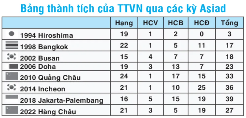 Tỷ lệ tham gia các trận “chung kết” của TTVN tại Asiad 19 được cho là kém nhất tính từ Asiad Bangkok 1998 (1 HCV, 5 HCB). Tại Asiad Busan 2002, TTVN giành đến 4 HCV và 7 HCB. Có một điểm cần chú ý, thời điểm đó Việt Nam chưa lọt vào tốp 3 đoàn dẫn đầu ở SEA Games lần nào. Sau Busan 2002, TTVN bắt đầu thể hiện sức mạnh của mình với ngôi số 1 tại SEA Games 2003, tiếp tục duy trì vị thế trong tốp 3 Đông Nam Á suốt từ đó đến nay. Kéo theo đó, số lượng huy chương giành được tại Asiad cũng tăng đều theo thời gian, từ 18 huy chương các loại ở Busan 2002 đến đỉnh cao là 39 huy chương tại Asiad 2018. Cũng tính từ Asiad tại Indonesia đến nay, TTVN cũng có 3 kỳ liên tiếp vượt qua Thái Lan trên bảng tổng sắp SEA Games.