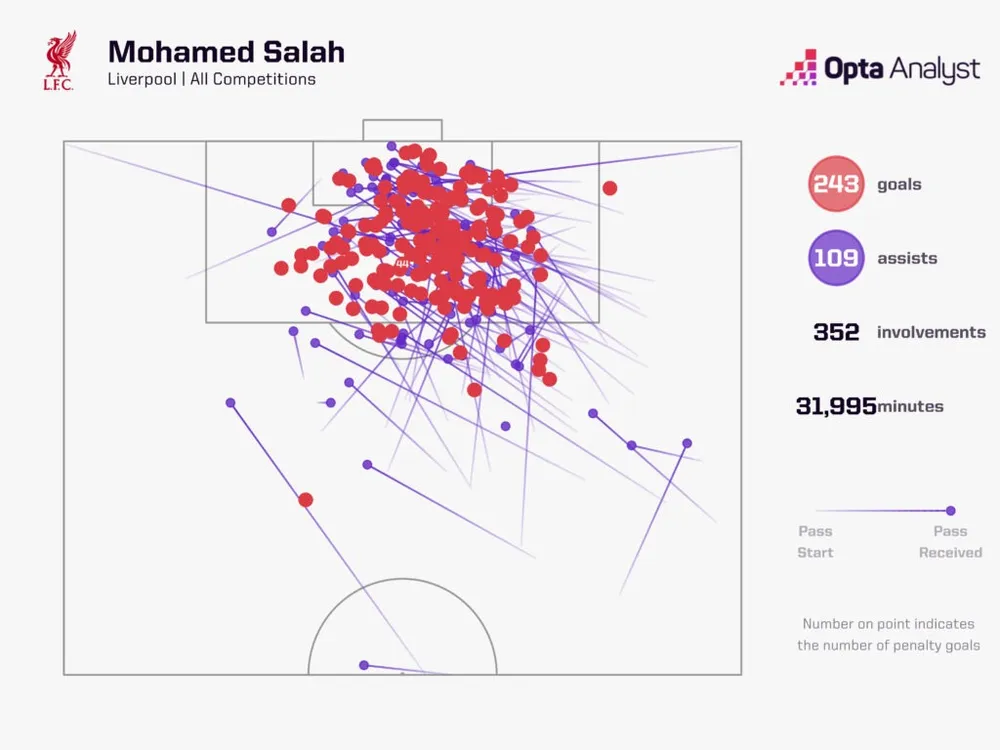 Số lần tham gia vào bàn thắng của Mo Salah tại Liverpool mọi thời đại