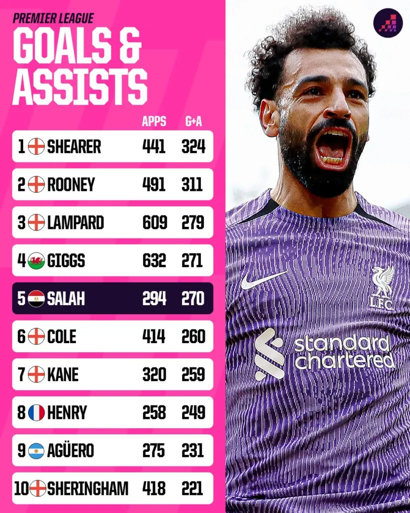 Ngay cả những giai đoạn thấp điểm của Salah cũng cho thấy anh là một cầu thủ xuất sắc như thế nào ở Premier League. Chẳng hạn, số bàn ít nhất anh ghi được ở giải đấu cho Liverpool là 18 (2023-24), một con số mà chỉ 15 cầu thủ (ngoài anh) đã vượt qua kể từ năm 2017. Anh đứng thứ năm về số lần tham gia vào bàn thắng ở Premier League (270), nhưng cần lưu ý rằng anh đã chơi ít hơn ít nhất 147 trận so với bất kỳ ai trong bốn người đứng trên. Thêm hai bàn hoặc kiến tạo sẽ giúp anh vượt qua Ryan Giggs (271), trong khi 10 sẽ đưa anh vượt qua Frank Lampard (279).