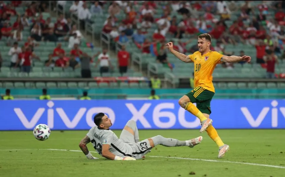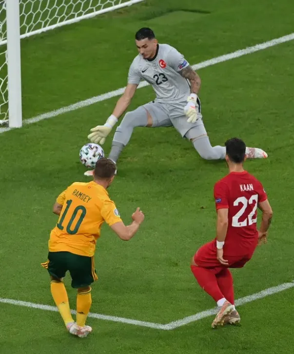 Phút 23, Aaron Ramsey có cơ hội không thể tốt hơn khi nhận đường chọc khe của Gareth Bale để lẻn vào vòng cấm địa. Không một hậu vệ Thổ Nhĩ Kỳ nào kịp băng về nên tiền vệ Juventus có thừa thời gian để dấn thêm vài bước, để nhử thủ thành lao ra, nhưng Ramsey không làm thế mà vung chân sút cực mạnh từ 12 thước, đưa bóng đi… vọt xà.