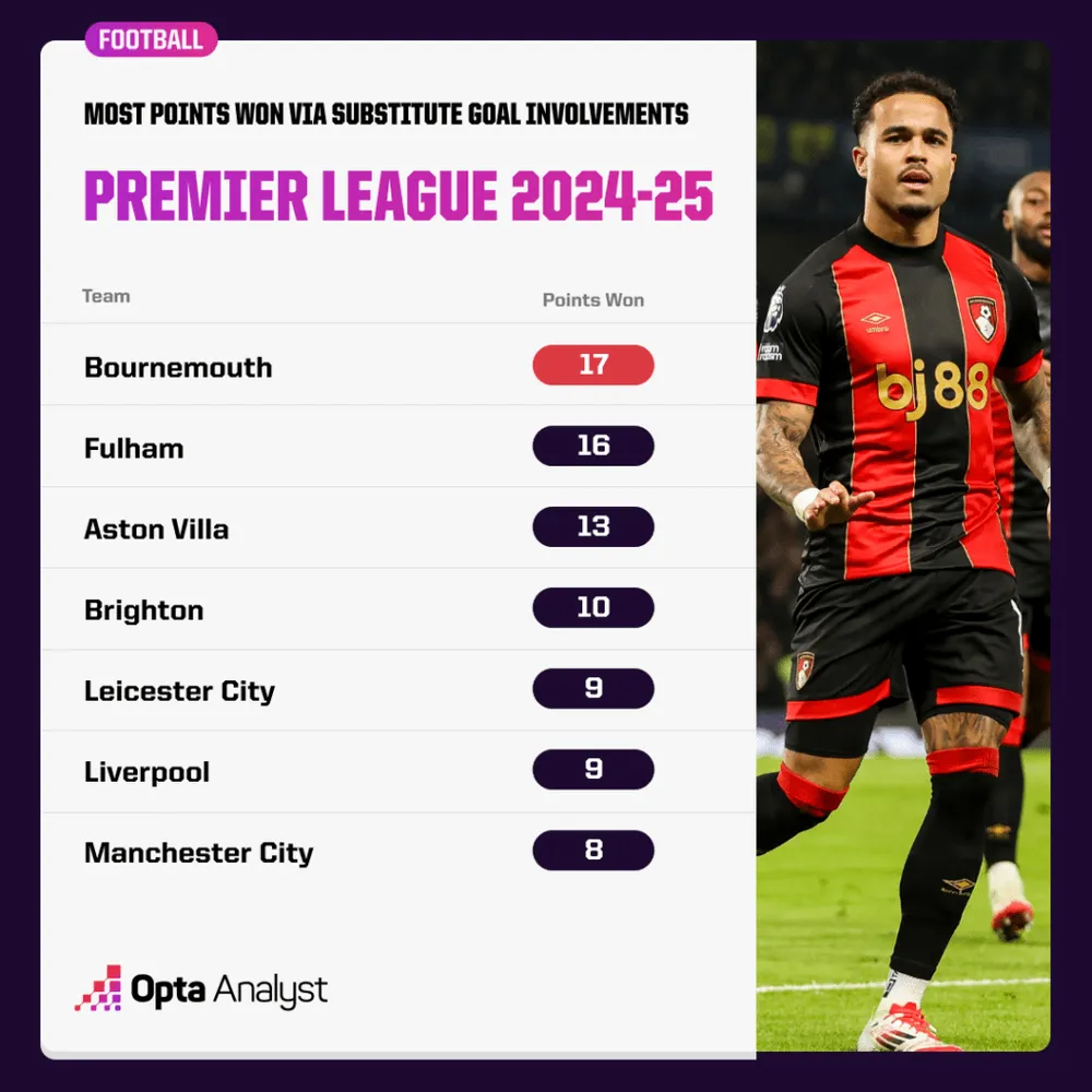 Không có gì ngạc nhiên khi Bournemouth giành được nhiều điểm nhất nhờ sự tham gia của các cầu thủ vào sân thay người (17), xếp trên Fulham (16), Aston Villa (13), Brighton (10), Leicester (9), Liverpool (9) và Manchester City (8).