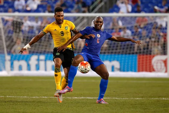 Giles Barnes (trái, Jamaica) ghi bàn thắng quyết định trước Haiti.