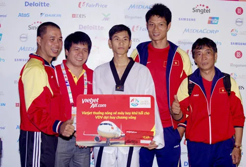 Ông Dương Hoài Nam (Vietjet) thưởng nóng VĐV Taekwondo Nguyễn Văn Duy.