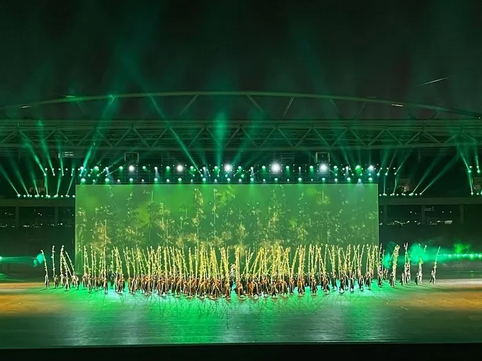 Nội dung của phần nghệ thuật là những màn biểu diễn với hình ảnh cây tre, hoa sen Việt Nam, áo dài, nón lá, trống khai hội...