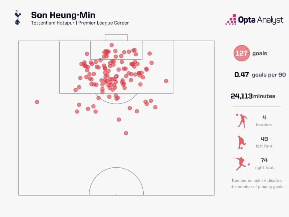 Hiếm có cầu thủ Premier League nào, đặc biệt là các tay săn bàn, thuận cả hai chân như Son. Trong số 80 cầu thủ ghi nhiều hơn 40 bàn bằng chân phải trong lịch sử Premier League, Son có tỷ lệ bàn thắng bằng chân trái cao nhất (38,6%). Với khả năng vượt qua đối thủ, di chuyển linh hoạt và sút bằng cả hai chân, ở đỉnh cao, anh gần như không thể bị ngăn cản.