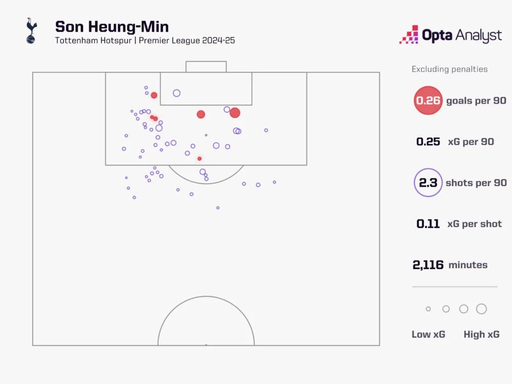 Son từng có những mùa giải mà xG không phạt đền của anh thấp tương tự, như 0,26 mỗi 90 phút mùa 2020-21, nhưng trước đây anh luôn bù đắp bằng khả năng dứt điểm xuất sắc. Mùa 2020-21, anh có cơ hội trị giá 8,9 xG cả mùa nhưng ghi 16 bàn, vượt kỳ vọng +7,1. Mùa 2024-25, anh chỉ có cơ hội trị giá 5,8 xG cả mùa và vượt kỳ vọng chỉ 0,2, ghi 6 bàn không phạt đền. Dù Son từng có những mùa kém hiệu quả trước đây và luôn trở lại, cảm giác về sự suy giảm phong độ khi gần bước sang tuổi 34 vẫn khó tránh khỏi.