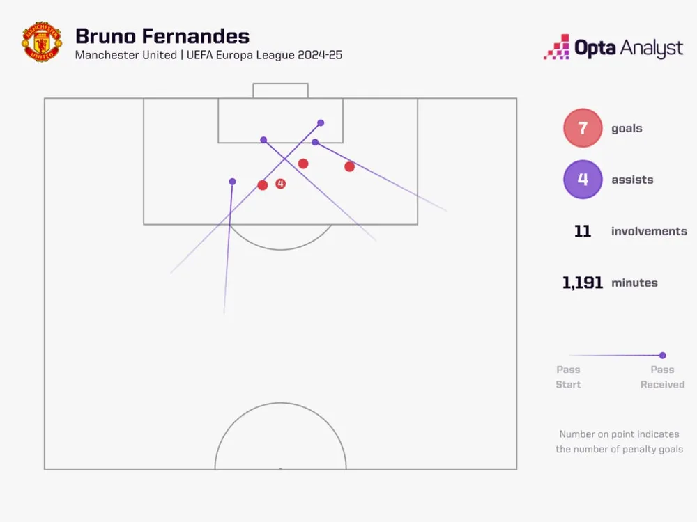 Nếu Man Utd giành chiến thắng, Bruno Fernandes chắc chắn sẽ là người truyền cảm hứng. Đội trưởng Man United có tổng cộng 46 lần tham gia vào bàn thắng trong lịch sử Europa League, nhiều nhất, và 19 đường kiến tạo của anh cũng là con số cao nhất trong giải đấu. Mùa này, chỉ có Rayan Cherki của Lyon (12) tham gia vào nhiều bàn thắng Europa League hơn Fernandes (bảy bàn, bốn kiến tạo). Cầu thủ duy nhất tham gia vào nhiều bàn hơn cho một câu lạc bộ Anh trong một mùa giải của giải đấu là Olivier Giroud của Chelsea năm 2018-19 (11 bàn, bốn kiến tạo). Một trận chung kết cởi mở được kỳ vọng, điều này có thể phù hợp với những cầu thủ như Fernandes, Alejandro Garnacho và Rasmus Højlund.