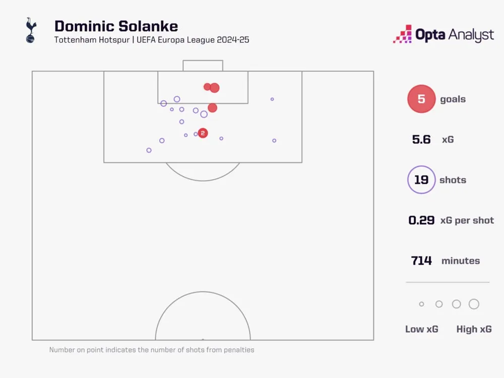 Son đã ghi 11 bàn trong mọi giải đấu mùa này, chỉ đứng sau Brennan Johnson (17), Dominic Solanke (15) và Maddison (12) về số bàn thắng cho Spurs. Nhiều khoảnh khắc xuất sắc nhất của Solanke đến từ giải đấu này, khi anh ghi bàn thắng quyết định từ chấm phạt đền trong trận tứ kết với Eintracht Frankfurt và trong cả hai lượt trận bán kết với Bodø/Glimt.
