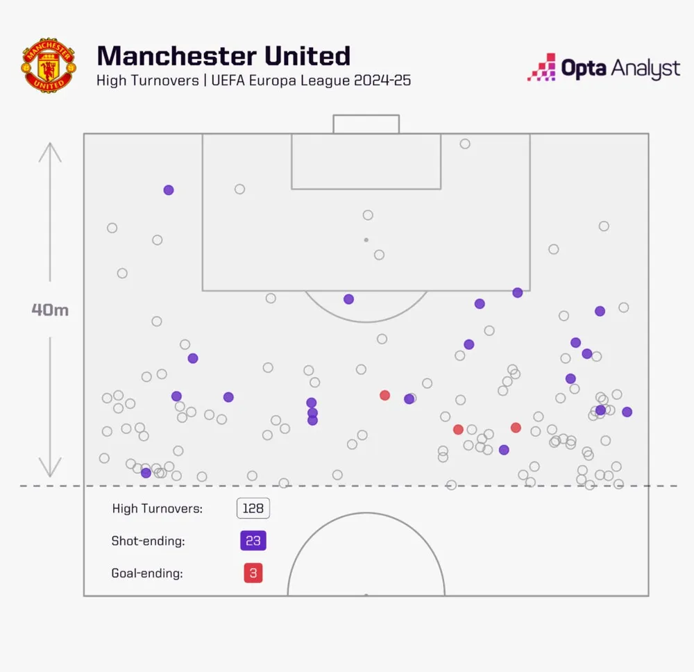 Chỉ có Athletic Club Bilbao (30) có nhiều cú sút sau các pha cướp bóng tầm cao hơn Man United (23) và Tottenham (22) trong Europa League mùa này, và Quỷ Đỏ cũng đứng đầu giải đấu 2024-25 về các pha tấn công trực diện (32, ngang bằng với Lyon).