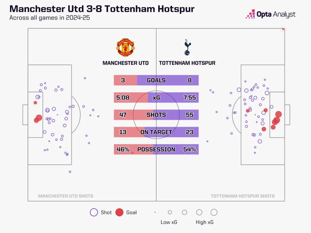 Họ cũng có thành tích tệ hại gần đây trước Spurs. Tottenham đã thắng cả ba trận gặp United trong mọi giải đấu mùa này, hai lần ở Premier League (3-0 trên sân khách, 1-0 trên sân nhà) và một lần ở EFL Cup (4-3 trên sân nhà).