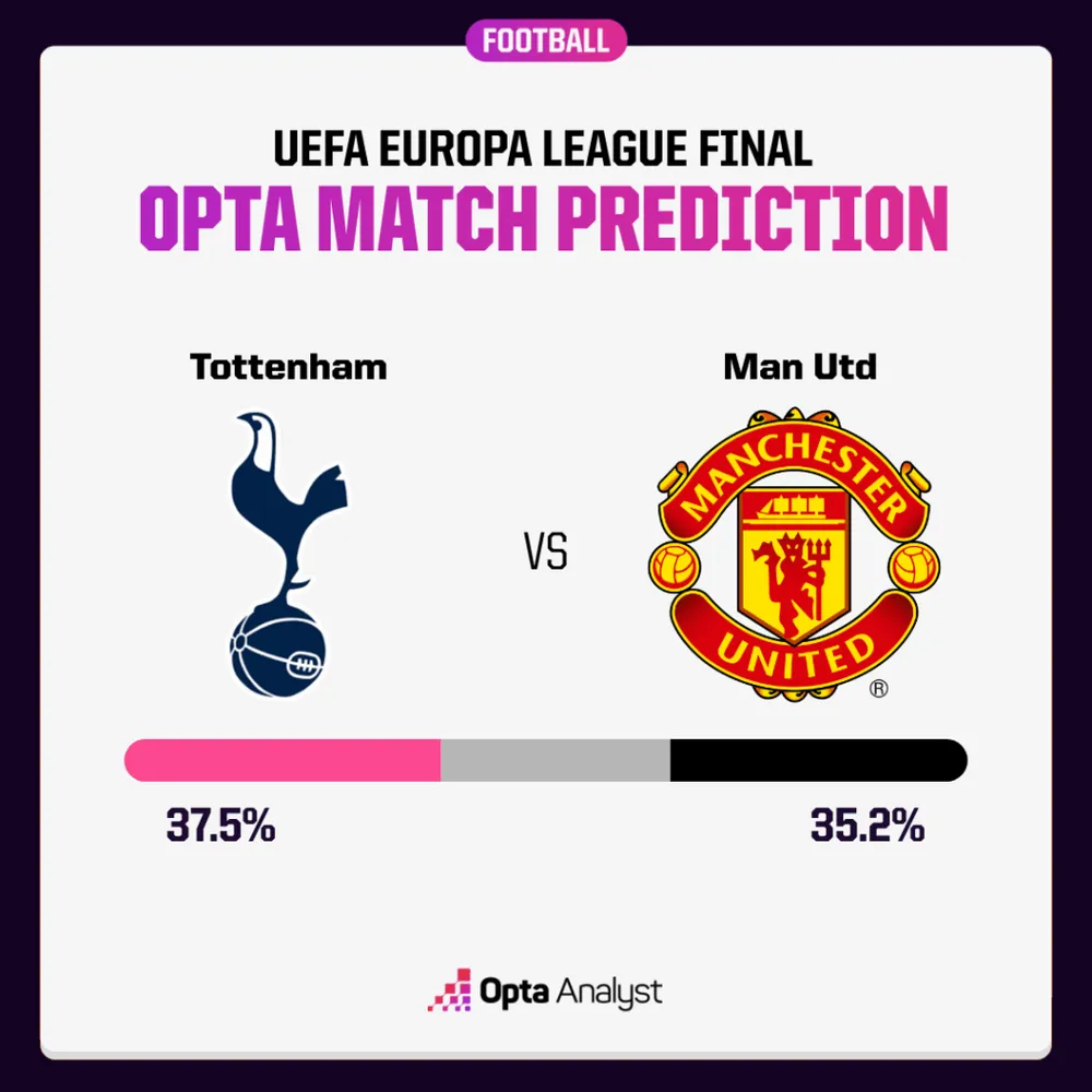Nhiều người kỳ vọng một trận chung kết sát nút, và thật đáng kinh ngạc, siêu máy tính Opta khó có thể phân định hai đội. Hiện tại, nó đánh giá Tottenham là đội có khả năng giành cúp Europa League vào thứ Tư (50,3%), nhỉnh hơn Man United (49,7%).