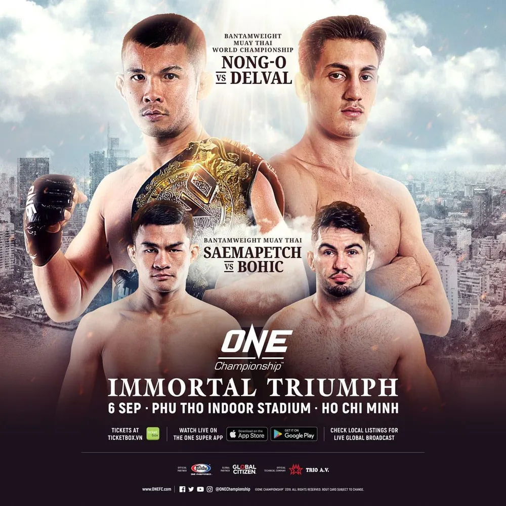 Cũng tại sự kiện được tổ chức ở TPHCM, nhà đương kim vô địch Muay Thái ONE hạng Bantamweight là Nong-O Gaiyanghadao (Thái Lan) sẽ bảo vệ danh hiệu của mình trước sự cạnh tranh của võ sĩ Brice Delval đến từ nước Pháp.