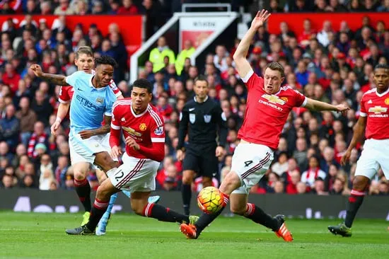 Raheem Sterling (trái, Man.City) tung cú sút trước hàng thủ Man.United.