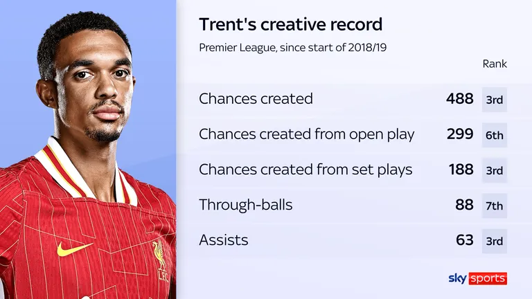 Thực tế, kể từ khi ra mắt Premier League vào tháng 12 năm 2016, Alexander-Arnold đã tạo ra số cơ hội nhiều thứ hai trong số các cầu thủ Premier League, chỉ đứng sau Kevin De Bruyne của Manchester City. Tổng cộng 514 cơ hội mà Alexander-Arnold tạo ra trong khoảng thời gian đó cao hơn 22% so với bất kỳ hậu vệ nào khác, với đồng đội tại Liverpool của anh, Andrew Robertson, đứng thứ hai với 421 cơ hội. Sau đó là Lucas Digne, trước đây chơi cho Everton và hiện tại là Aston Villa, với 330 cơ hội.