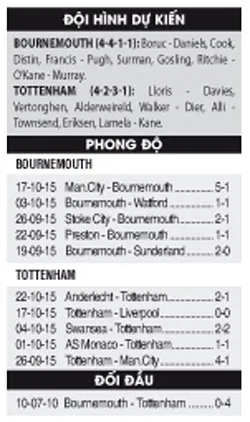 Câu hỏi lớn nhất lúc này của Tottenham là việc chân sút số 1 của họ Harry Kane có tận dụng sự suy yếu của Bournemouth để ghi bàn hay không. Nhưng, niềm tin cũng có thể đặt vào tiền vệ sáng tạo Christian Eriksen khi 9 trong 12 bàn gần nhất của anh là ghi trên sân khách, bao gồm 2 pha đá phạt tuyệt đẹp trong trận hòa tại Swansea mới đây.