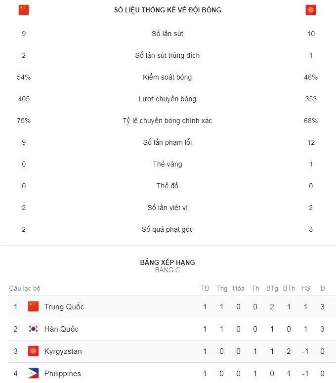 Trung Quốc quyết tâm giành 3 điểm trước Kyrgyzstan nhưng phút 42, Israilov kịp sút tung lưới Trung Quốc mở tỷ số. Sai lầm của thủ môn Matiash biếu bàn thắng gỡ hòa và Yu Dabao ghi bàn ấn định chiến thắng 2-1 cho Trung Quốc. Trận tiếp theo, Trung Quốc gặp Philippines còn Kyrgyzstan gặp đối thủ Hàn Quốc.