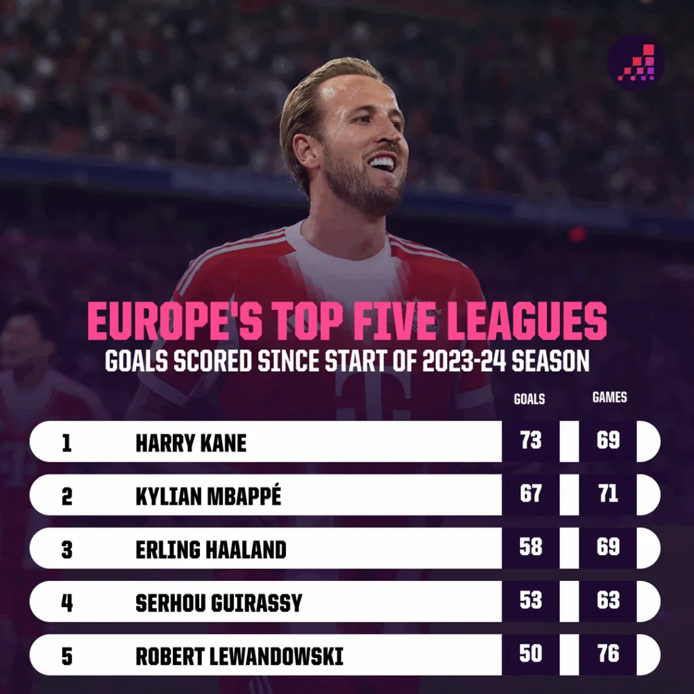 Tính từ khi rời Tottenham năm 2023, Kane đã ghi 73 bàn sau 69 trận Bundesliga – vượt xa Mbappé (67 bàn/71 trận) và Haaland (58 bàn/69 trận). Ở mọi đấu trường, anh dẫn đầu châu Âu với 103 bàn sau 106 trận, hơn Mbappé (102) và bỏ xa Haaland (84).