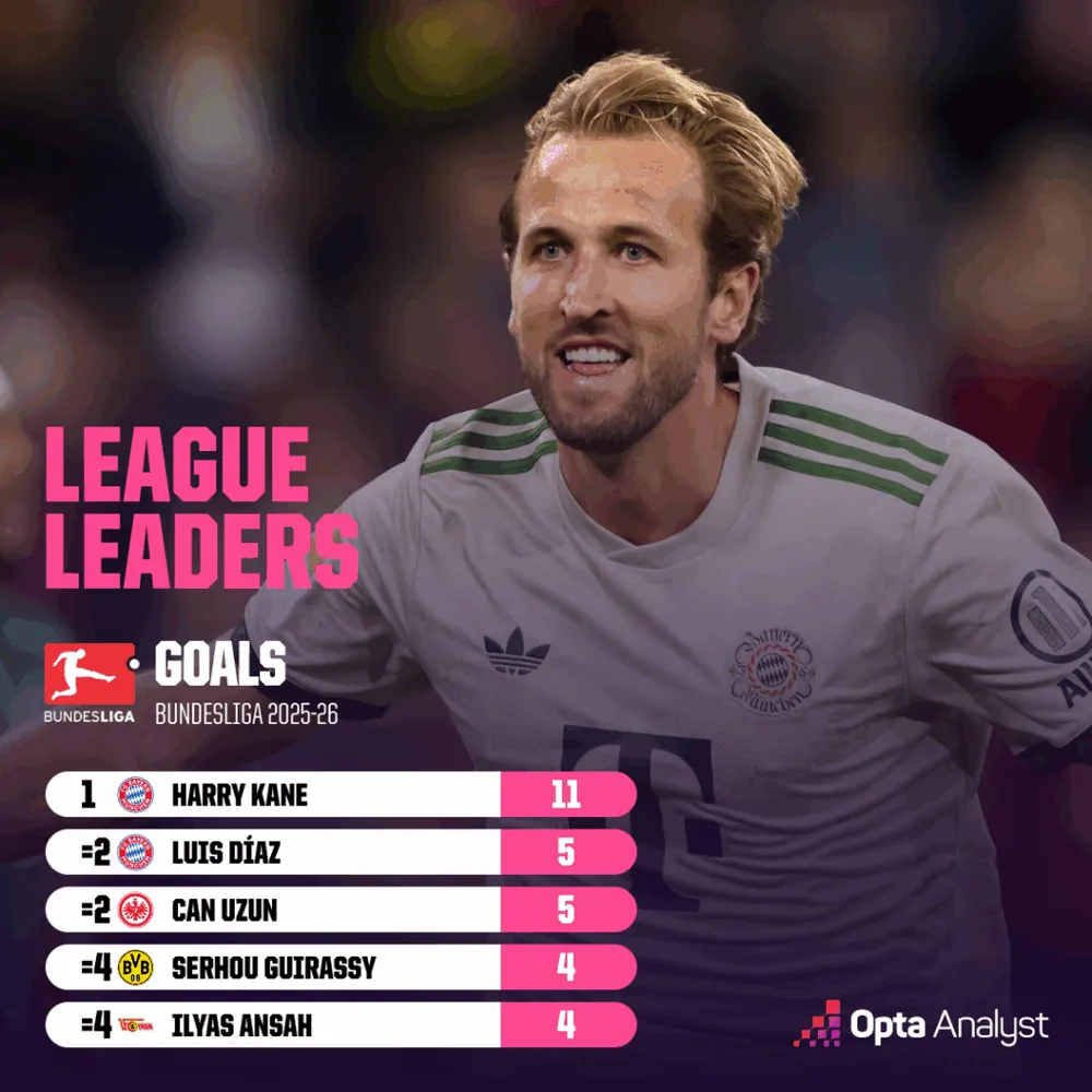 Những thống kê đủ nói thay lời. Trong màu áo Bayern, Kane đã ghi 21 bàn sau 15 trận gần nhất tính trên mọi đấu trường, trong đó có 11 bàn chỉ sau 6 vòng Bundesliga, đồng thời cũng là cầu thủ có hiệu suất cao nhất trong top 10 giải vô địch châu Âu. Nếu duy trì tốc độ này, Kane hoàn toàn có thể phá kỷ lục 41 bàn/mùa Bundesliga mà Robert Lewandowski thiết lập năm 2021.