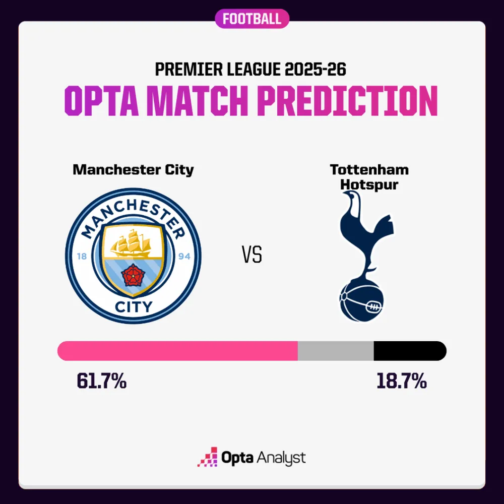 Siêu máy tính Opta dự đoán Man City có 61,7% cơ hội thắng, Spurs thắng 18,7%, và hòa là 19,6%. Dù Spurs có thành tích tốt trước City tại Etihad, sức mạnh hiện tại của Man City, cùng lợi thế sân nhà, khiến họ được đánh giá cao hơn. Tuy nhiên, với phong độ của Richarlison và kinh nghiệm đánh bại City của Frank (từng thắng 2-1 tại Etihad khi dẫn dắt Brentford), Spurs vẫn có thể tạo bất ngờ.
