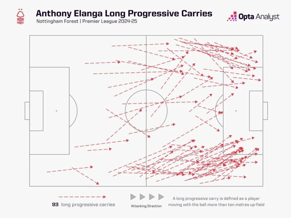 Hiện tại, Elanga là cầu thủ hiệu quả nhất Premier League trong việc đưa bóng lên phía trước với tốc độ cao. Anh đứng đầu tất cả cầu thủ trong giải đấu chơi ít nhất 300 phút mùa này về khoảng cách trung bình mỗi lần dẫn bóng (15,2 mét), khoảng cách trung bình mỗi lần dẫn bóng tiến gần hơn tới khung thành đối phương (11,9 mét) và tỷ lệ khoảng cách dẫn bóng thẳng tiến lên phía trước so với tổng khoảng cách (78,6%). Sự trực diện này là vũ khí lớn cho Forest dưới sự dẫn dắt của Nuno Espírito Santo, người muốn đội bóng tấn công nhanh bất cứ khi nào có thể.
