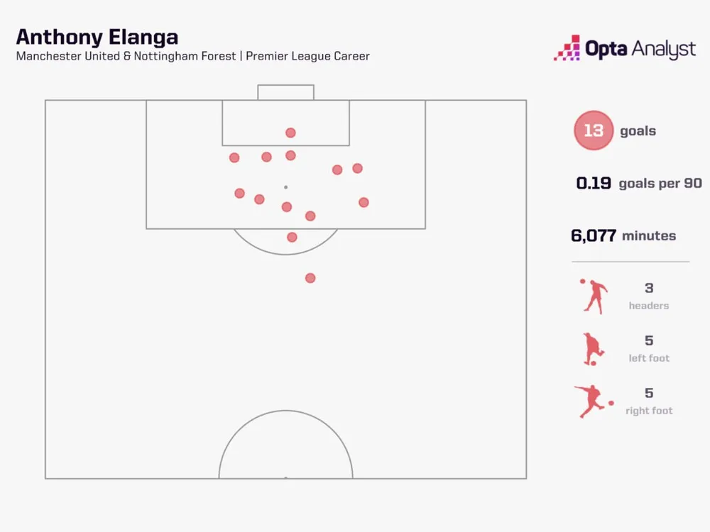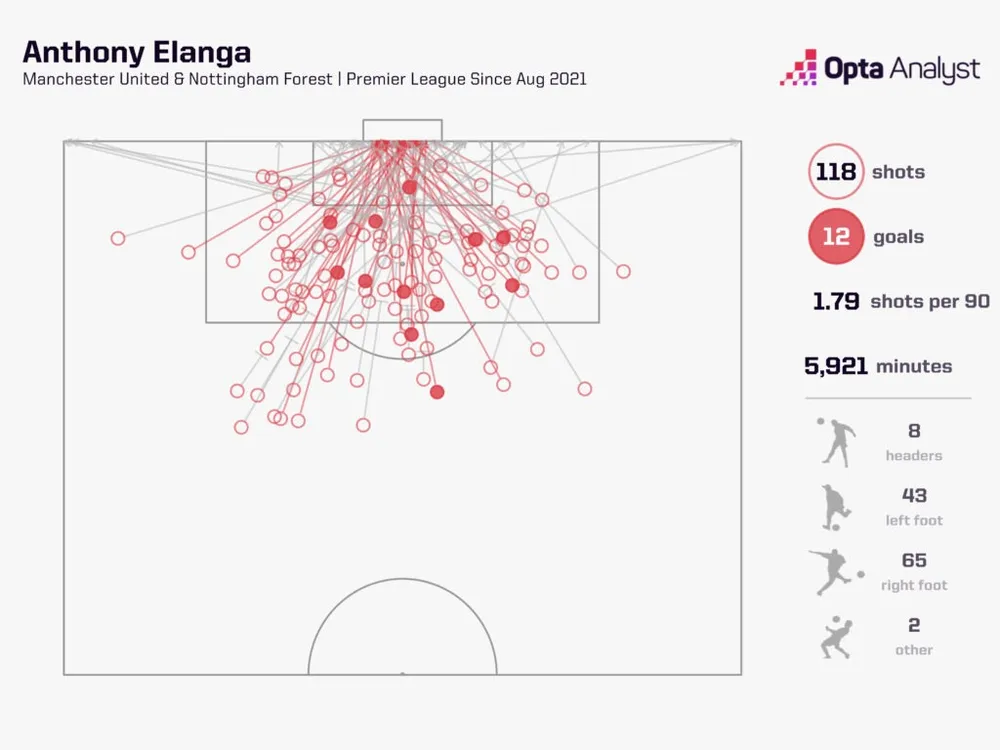 Anh ghi hai bàn từ tổng khoảng cách 38,8 mét so với khung thành, xa thứ hai trong số 15 cú đúp hai chân ở Premier League mùa này (sau cú đúp của Justin Kluivert, ghi từ 39,7 mét, trước Newcastle). Ghi bàn cận thành bằng chân không thuận dễ hơn nhiều so với ghi bàn từ khoảng cách mà Elanga thực hiện. Không có gì ngạc nhiên khi thấy Elanga sút hoặc ghi bàn bằng cả hai chân. Anh luôn thoải mái với cả hai bên, với 5 bàn ở Premier League bằng chân phải và 5 bàn bằng chân trái.