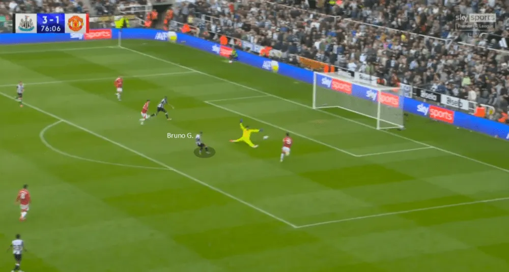 Nhưng thay vào đó, anh chuyền bóng trúng đầu Joelinton, người đánh đầu đưa bóng đến chân Bruno Guimarães…