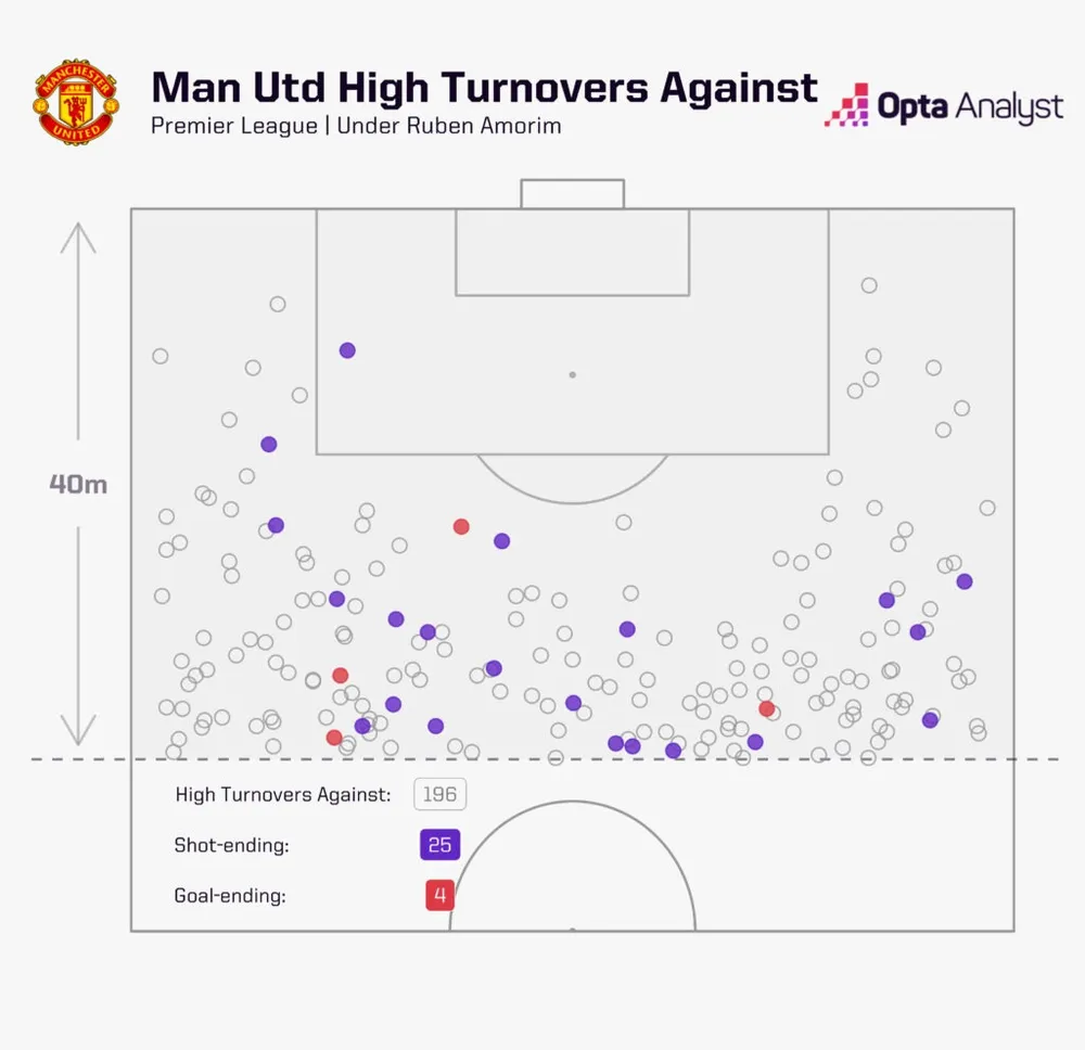Chỉ 12,8% trong số đó dẫn đến cú sút – tỷ lệ thấp thứ ba trong giải – cho thấy Man Utd khá hiệu quả trong việc tổ chức lại và ngăn đối thủ tạo cơ hội, có lẽ nhờ hệ thống ba hậu vệ. Nhưng không cần để đối thủ sút, họ vẫn bị đặt vào tình thế khó khăn. Và thật khó để nhìn nhận tích cực sau trận đấu Chủ nhật. Các đội chơi từ tuyến sau thường bị ghi nhận nhiều lần giành bóng cao hơn – đó là rủi ro khi cầm bóng nhiều ở phần sân nhà.