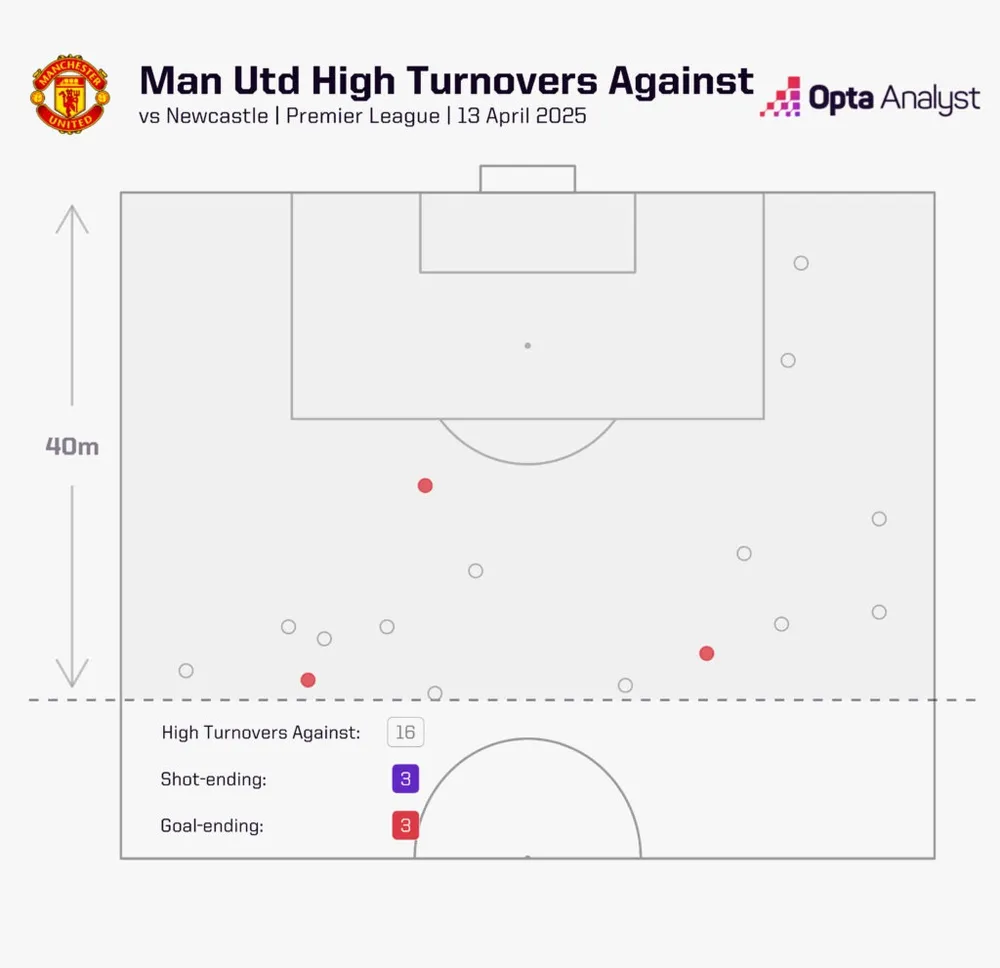 Joshua Zirkzee có một số khoảnh khắc nổi bật trước khi rời sân vì chấn thương, nhưng anh bị Fabian Schär và Dan Burn áp đảo khi Man Utd cố chơi trực diện đến anh, thêm bằng chứng rằng anh không phù hợp làm điểm đến của những đường bóng dài – và không ai trong đội hình phù hợp cả. Newcastle kết thúc trận đấu với ba lần giành bóng cao (cướp bóng trong vòng 40m từ khung thành đối phương) dẫn đến bàn thắng, ngang với kỷ lục trong một trận Premier League mùa này.