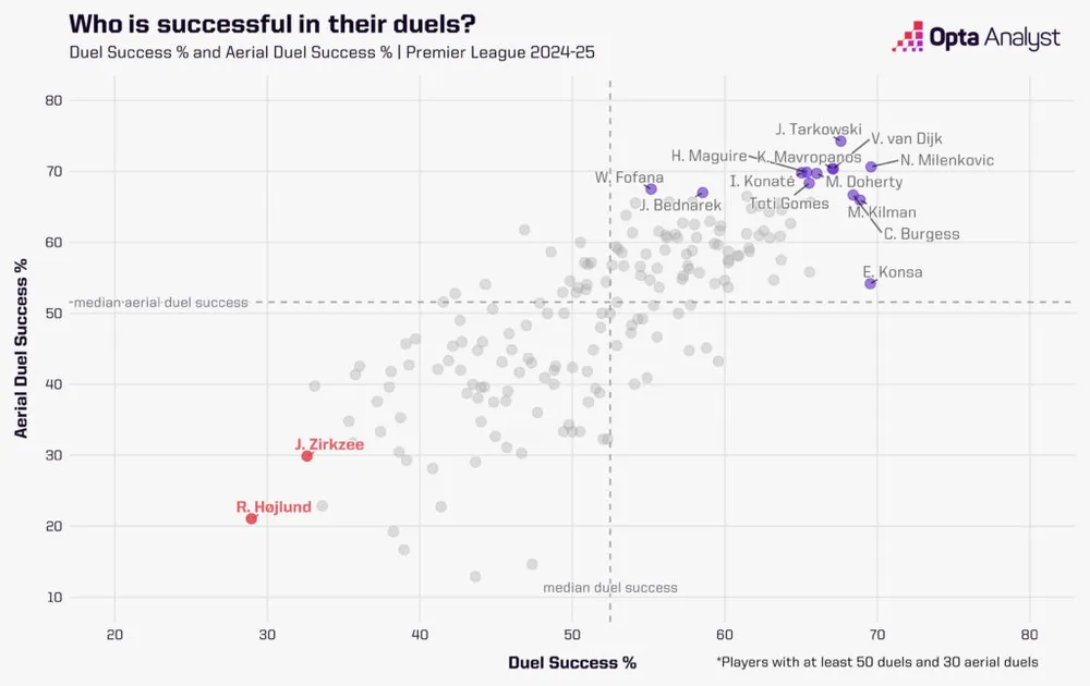 Tóm lại, Man Utd muốn xây dựng từ tuyến sau nhưng kém hiệu quả trong việc biến tư duy này thành áp lực thực sự vì họ không hiệu quả trong việc tiến bóng lên – điều không được cải thiện bởi sự vắng mặt kéo dài của Lisandro Martínez. Vấn đề thêm là họ không thực sự có lựa chọn chơi trực diện – ít nhất không theo cách thông thường. Trong số các cầu thủ chơi ít nhất 900 phút và tranh chấp trên không ít nhất 30 lần, chỉ bốn người có tỷ lệ thắng không chiến kém hơn Rasmus Højlund (21,1%), và Zirkzee (29,9%) chỉ khá hơn sáu bậc. Tương tự, trong số các cầu thủ tranh chấp ít nhất 50 lần, Højlund (29%) và Zirkzee (32,6%) nằm trong nhóm ba người có tỷ lệ thắng thấp nhất.