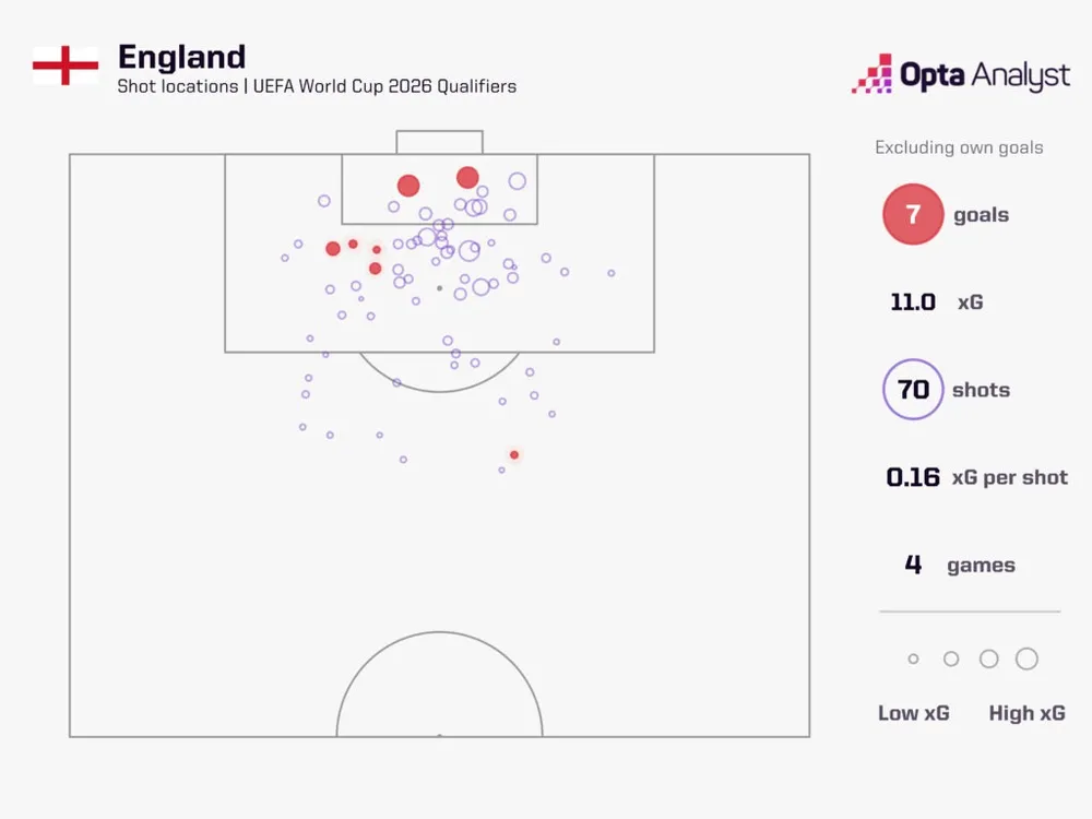 Gareth Southgate từng bị chỉ trích vì lối chơi thực dụng dù sở hữu nhiều ngôi sao, nhưng Tuchel cũng chưa mang lại sự phấn khích, dù Anh đang dẫn đầu bảng K vòng loại World Cup 2026 với 12 điểm sau bốn trận. Anh ghi tám bàn trong bốn trận vòng loại, với chỉ số bàn thắng kỳ vọng (xG) 11,0 – xếp thứ tư ở châu Âu. Dù vậy, các đội mạnh như Pháp, Đức, Bồ Đào Nha và Tây Ban Nha mới bắt đầu chiến dịch, trong khi Hà Lan và Italy thi đấu ít trận hơn.