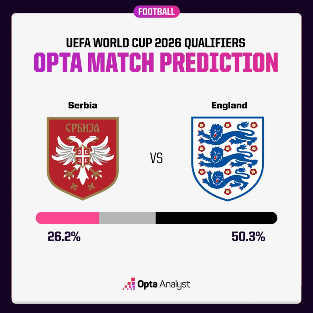 Theo siêu máy tính Opta, Anh được đánh giá cao hơn với 50,3% cơ hội thắng, Serbia có 26,2% và hòa là 23,5%. Với hàng thủ vững chắc và khả năng tấn công hiệu quả, Anh có thể tiếp tục mạch thắng, nhưng Serbia sẽ không dễ bị đánh bại trên sân nhà.