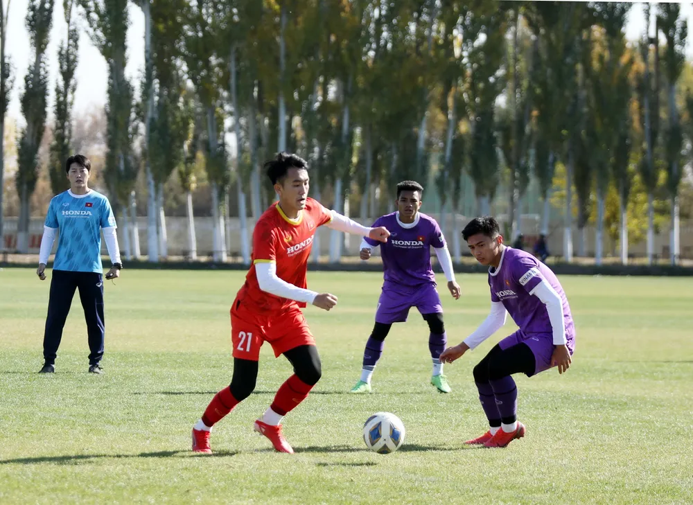 Sáng 24-10, đội tuyển U22 Việt Nam đã có trận đấu tập đầu tiên và là duy nhất kể từ khi sang Kyrgyzstan để chuẩn bị cho vòng loại U23 châu Á 2022. Đây là trận đấu tập nội bộ, HLV Park Hang-seo đã chia đôi đội hình thi đấu nhằm kiểm tra lần cuối phong độ của từng vị trí.