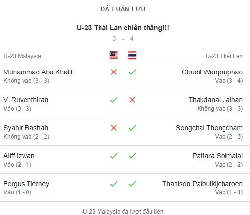⚽ Tỷ số luân lưu: U23 Thái Lan thắng U23 Malaysia tỷ số 4-3