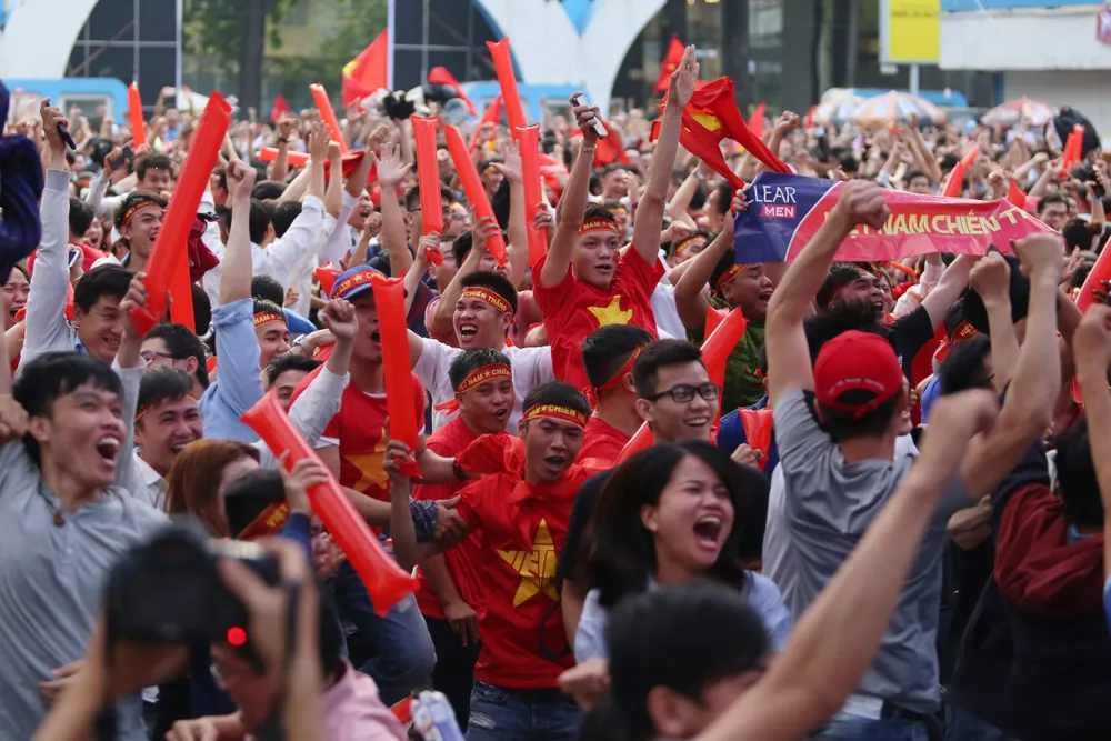 Đông đảo người hâm mộ bóng đá TPHCM đã đến NVH Thanh Niên xem truyền hình trực tiếp trận đấu. Ảnh: HOÀNG HÙNG
