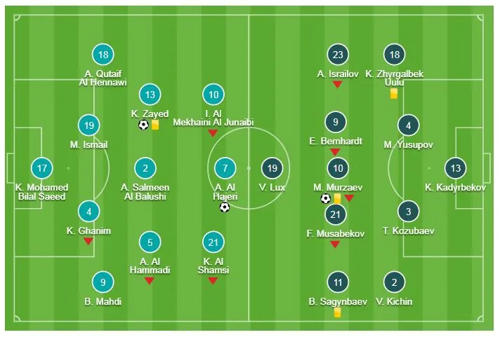 Chủ nhà UAE sớm có bàn thắng phút 14 của Esmaeel nhưng chủ quan nên bị Murzaev gỡ hòa 1-1 và Mabkhout tiếp tục đua chủ nhà lên dẫn trước 2-1, sai lầm phút 90+1 giúp Rustamov gỡ hòa 2-2 đưa trận đấu vào hiệp phụ. Phút 120+2, Khalil ấn định chiến thắng 3-2, chủ nhà UAE vào tứ kết Asian Cup 2019 gặp Australia.