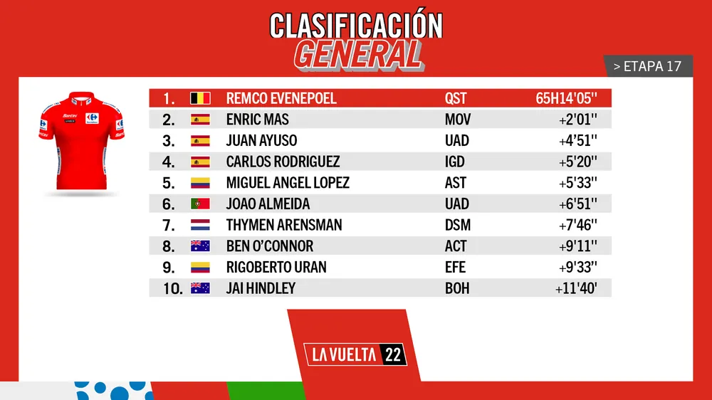 Dù không còn Primoz Roglic làm đối trọng lớn với áo đỏ Remco Evenepoel trên đường đua, chặng thứ 17 vẫn diễn khá hấp dẫn. Hành trình 160km nhiều đèo dốc từ Aracena đến Monasterio de Tentudía đã chứng kiến nhiều cuộc tấn công ngay sau khi xuất phát. Nhưng phải sau khoảng 40km, Quentin Pacher (Groupama-FDJ) và Bob Jungels (AG2R Citroën) mới kéo được một nhóm khá đông gồm Clement Champoussin, Gino Mader, Fred Wright (Bahrain Victorious), Jesus Herrada (Cofidis), Rigoberto Uran (EF Education-EasyPost), Lawson Craddock (BikeExchange-Jayco), Kenny Elissonde (Trek -Segafredo), Marc Soler (UAE Emirates), Elie Gesbert, Simon Guglielmi (Arkea-Samsic) và Alessandro De Marchi (Israel Premier Tech) thoát đi.