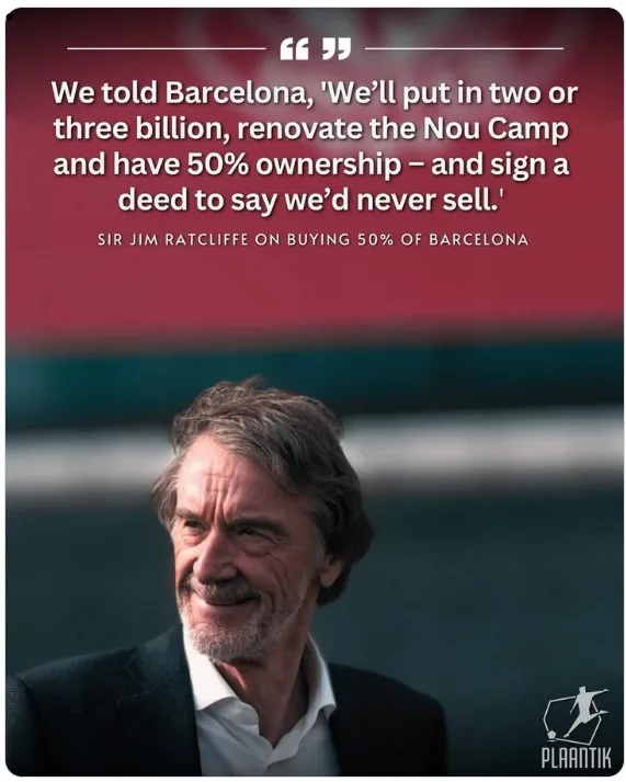 Sir Jim Ratcliffe nhấn mạnh: "Chúng tôi nói với họ đừng làm vậy, rằng chúng tôi sẽ bỏ ra 2 hoặc 3 tỷ đô la, cải tạo Camp Nou để có được 50% quyền sở hữu, đồng thời ký một chứng thư nói rằng chúng tôi sẽ không bao giờ bán nó". Ông cho biết thêm: "Mối quan tâm của chúng tôi chỉ là bóng đá, không phải kiếm tiền. Tôi nghĩ nó sẽ hiệu quả, chúng tôi đã nói về mục tiêu của mình nhưng cuối cùng, Barcelona không nghĩ rằng họ có thể hợp tác theo cách đó".