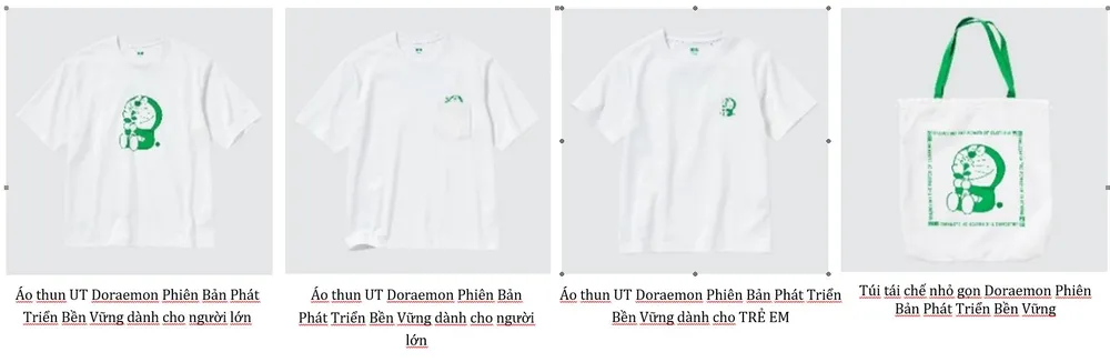 + Dịp này, UNIQLO công bố ra mắt loạt thiết kế mới, sử dụng 100% chất liệu polyester tái chế (gồm áo thun và túi có thể gấp gọn) với hình ảnh Đại sứ Toàn cầu về Phát triển bền vững của UNIQLO - Doraemon Phiên bản Phát triển bền vững màu xanh lá. Các sản phẩm mang hình ảnh nhân vật hoạt hình nổi tiếng này được ra mắt vào Ngày Môi trường Thế giới 5-6, khởi động chiến dịch Join: The Power Of Clothing mùa hè 2023.